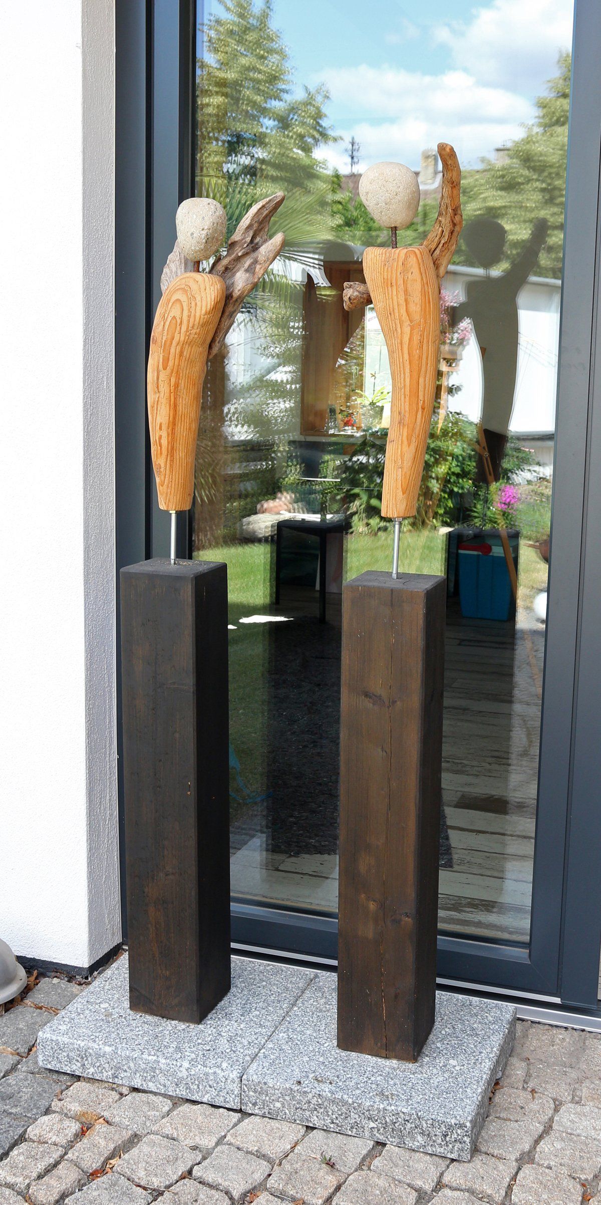 In meinen Skulpturen treffen sich über 300 Jahre alte Eichenbalken aus unserem Anwesen, Steine und Schwemmhölzer aus der Reuss, Ytong, Beton, Stahl und andere Materialien in einer Gesamtkomposition.